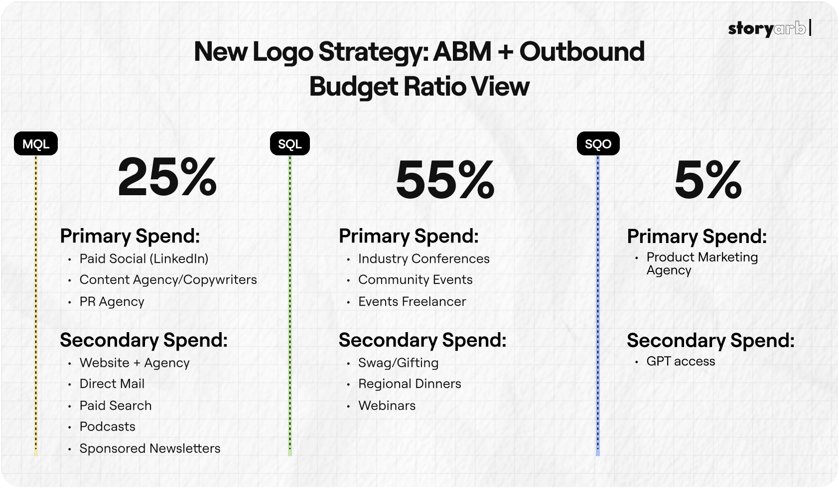 Within each stage, Sarah distinguished primary spend (core channels like LinkedIn, content agency, PR for MQL) from secondary spend (experiments like direct mail, podcast sponsorships) that could be cut if needed to reallocate to better-performing motions.