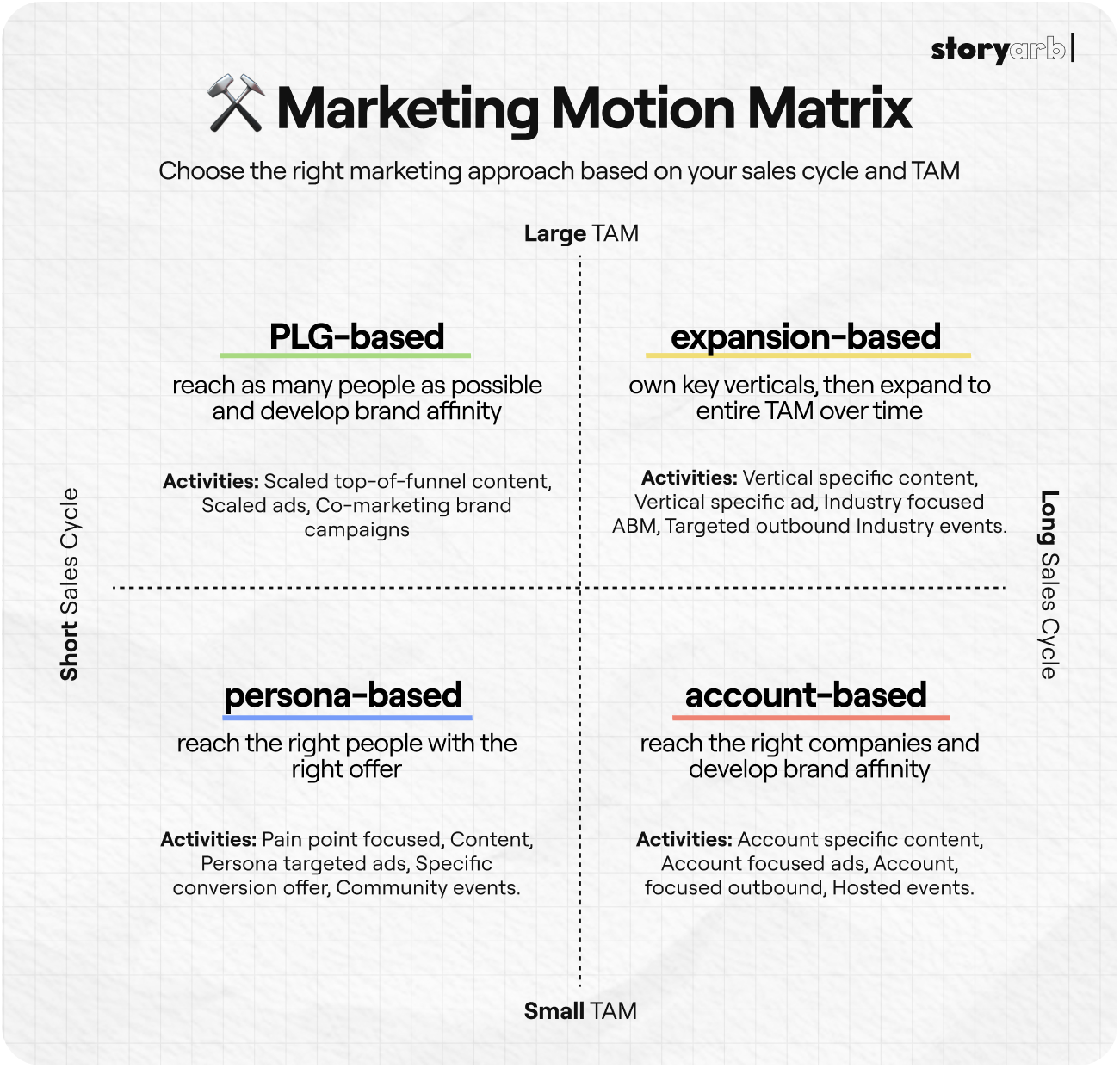 The right marketing motion for you depends on your business model. Consider the length of your sales cycle and your total addressable market to decide where to put your attention (and budget).