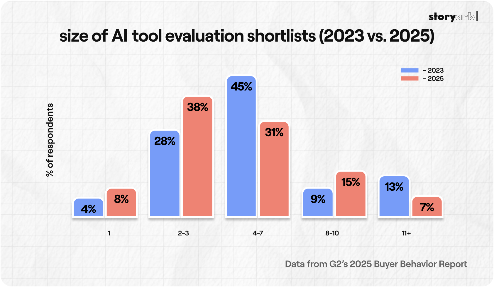 G2 found that this consolidation is already underway. Shortlists with just 2–3 vendors grew from 28% in 2023 to 38% in 2025. Single-vendor shortlists doubled over the same period. And a growing share of buyers choosing just one platform to evaluate at all. “8% of buyers now shortlist a single vendor,” Sydney notes.